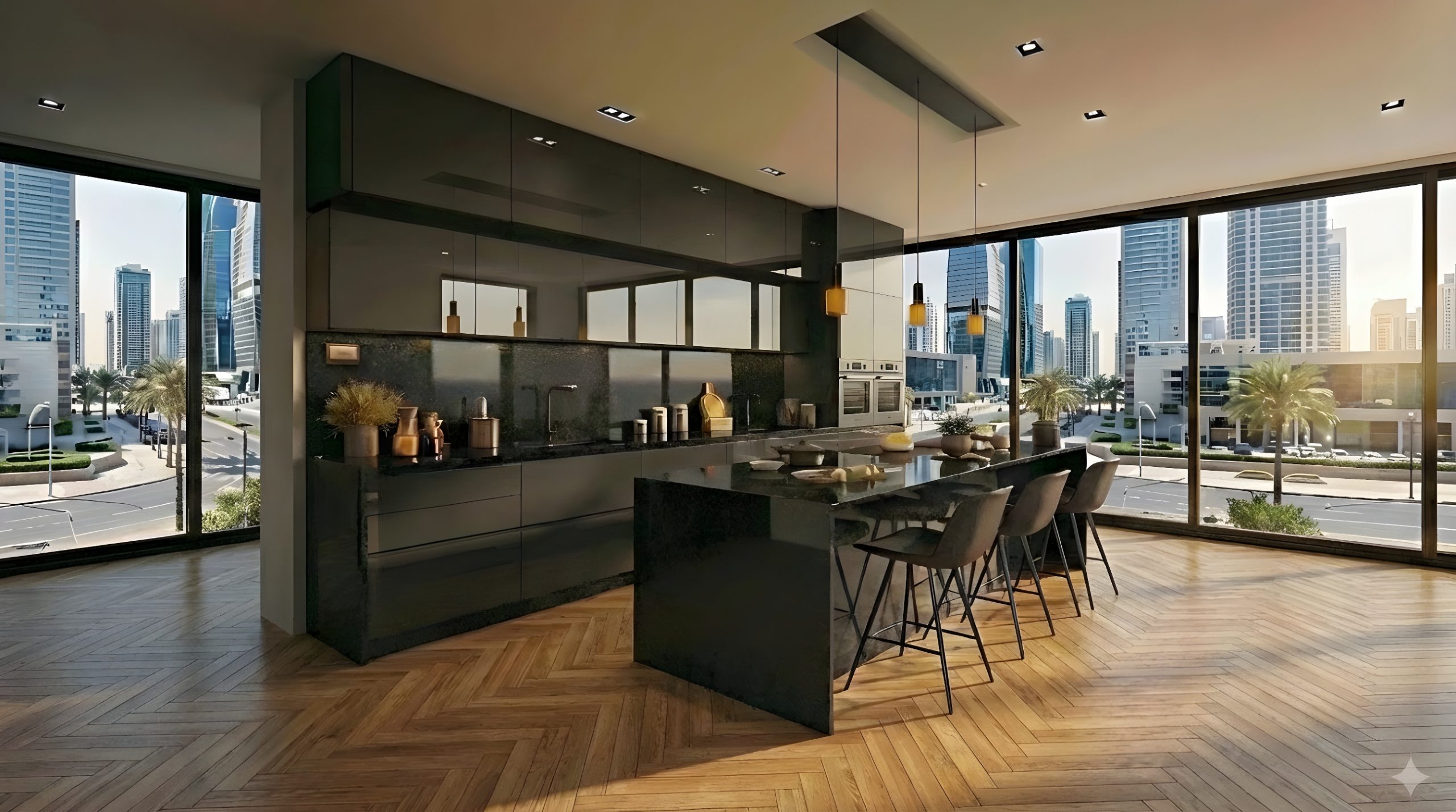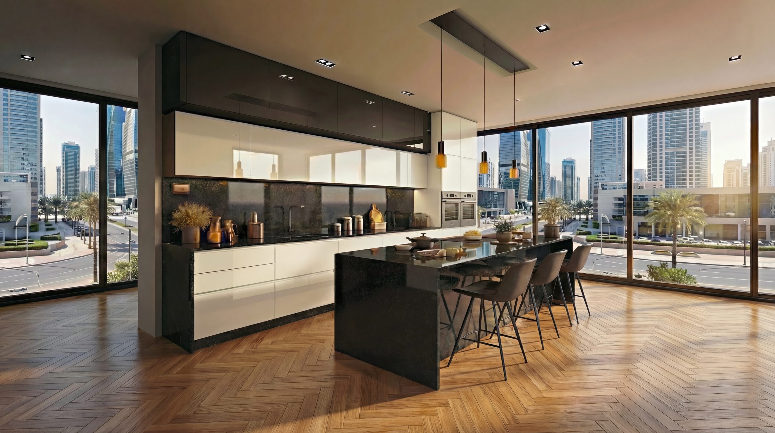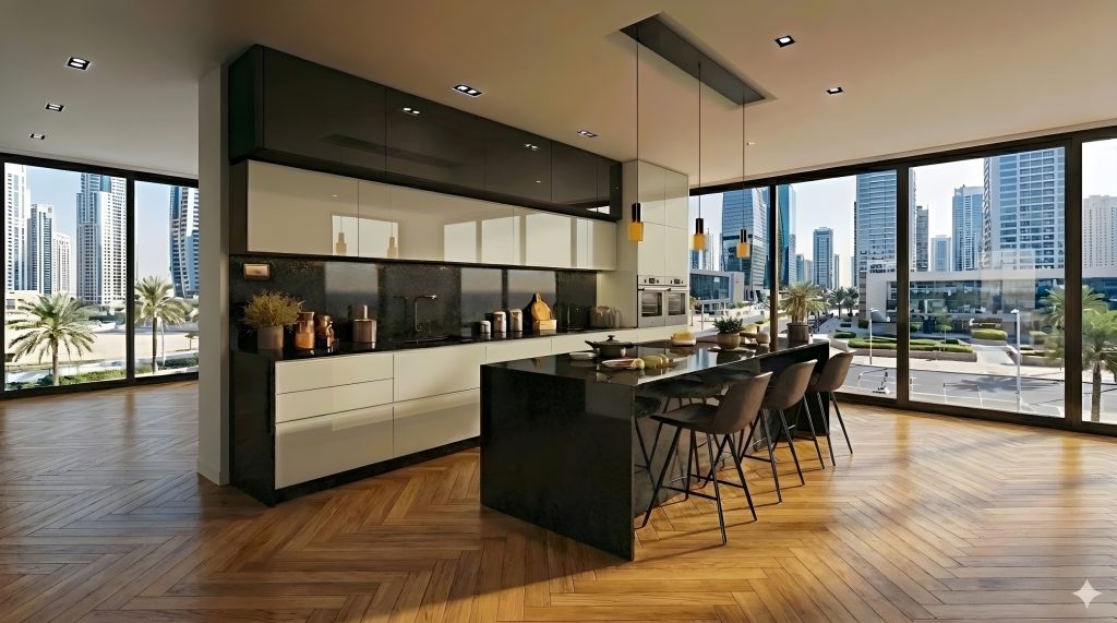 La modernité, c’est aussi l’effacement des frontières. Nos concepts de cuisine ouverte sont pensés pour s’intégrer face à de grandes baies vitrées. Que vous profitiez d’une vue sur mer à Tanger ou d’un panorama urbain à Rabat, la teinte carbone s’adapte aux variations de la lumière extérieure tout au long de la journée.